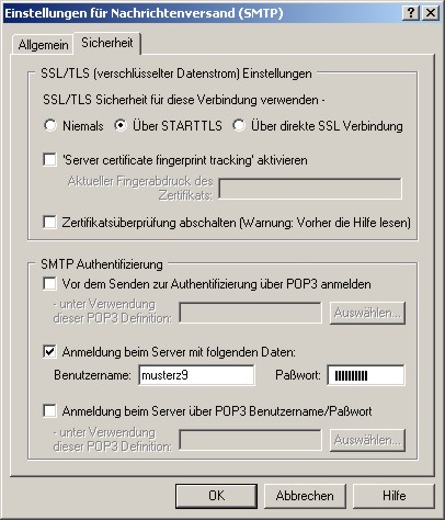 Auf der Karteikarte „Sicherheit“ ist wiederum „Über STARTTLS“ einzustellen. Die SMTP-Authentifizierung können Sie einstellen, wie sie möchten. Die im Screenshot gezeigte Variante ist nicht unbedingt zu empfehlen, da Passworte nicht innerhalb der Applikationen gespeichert werden sollten.